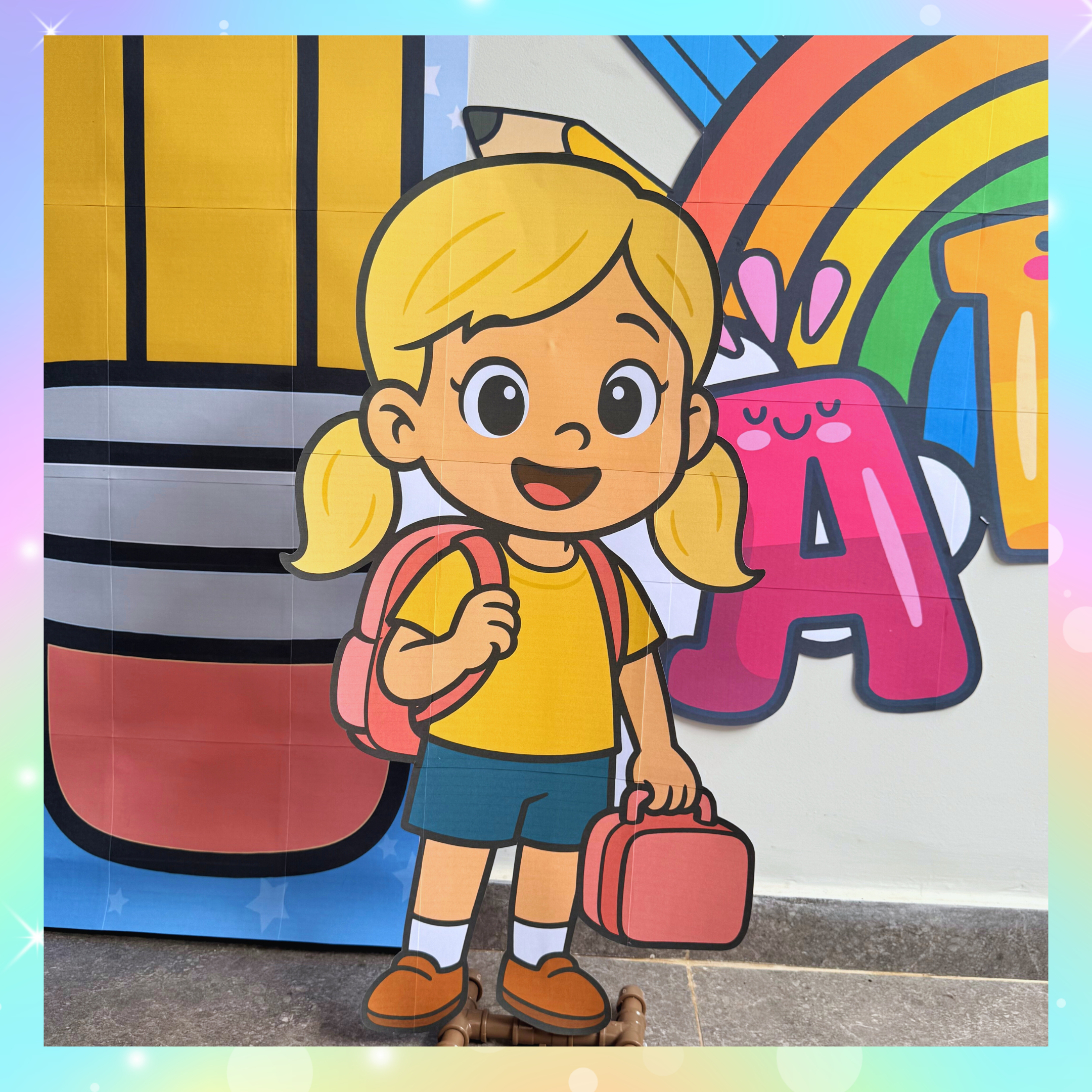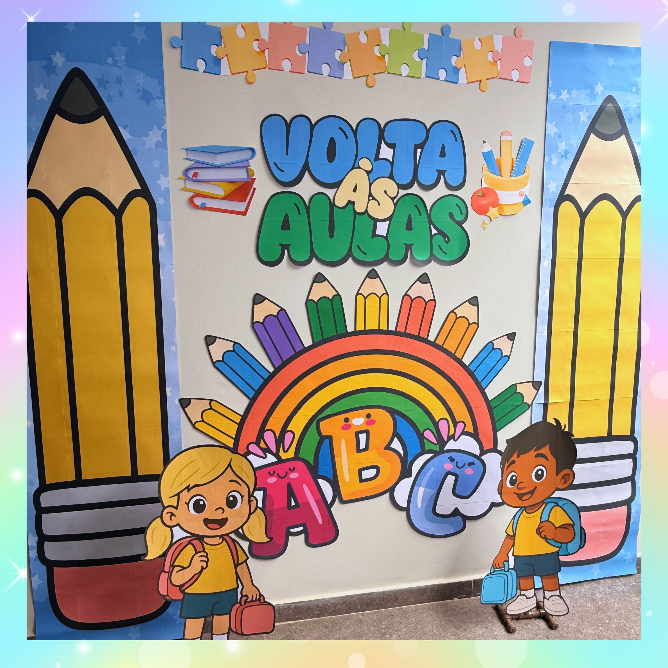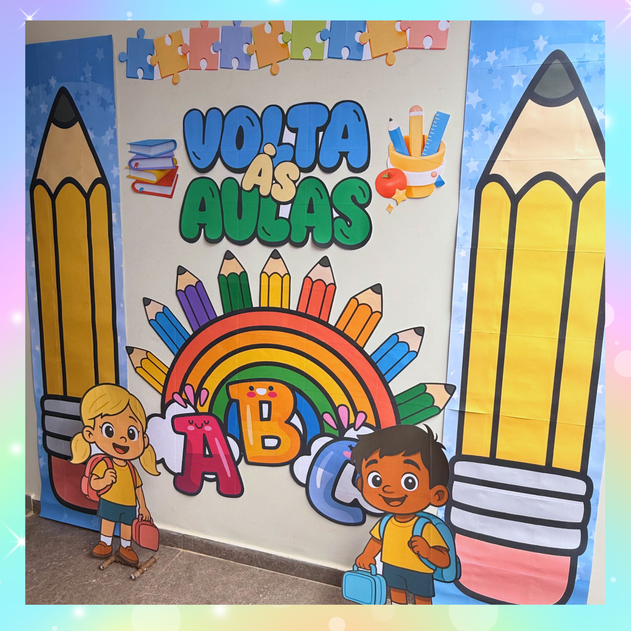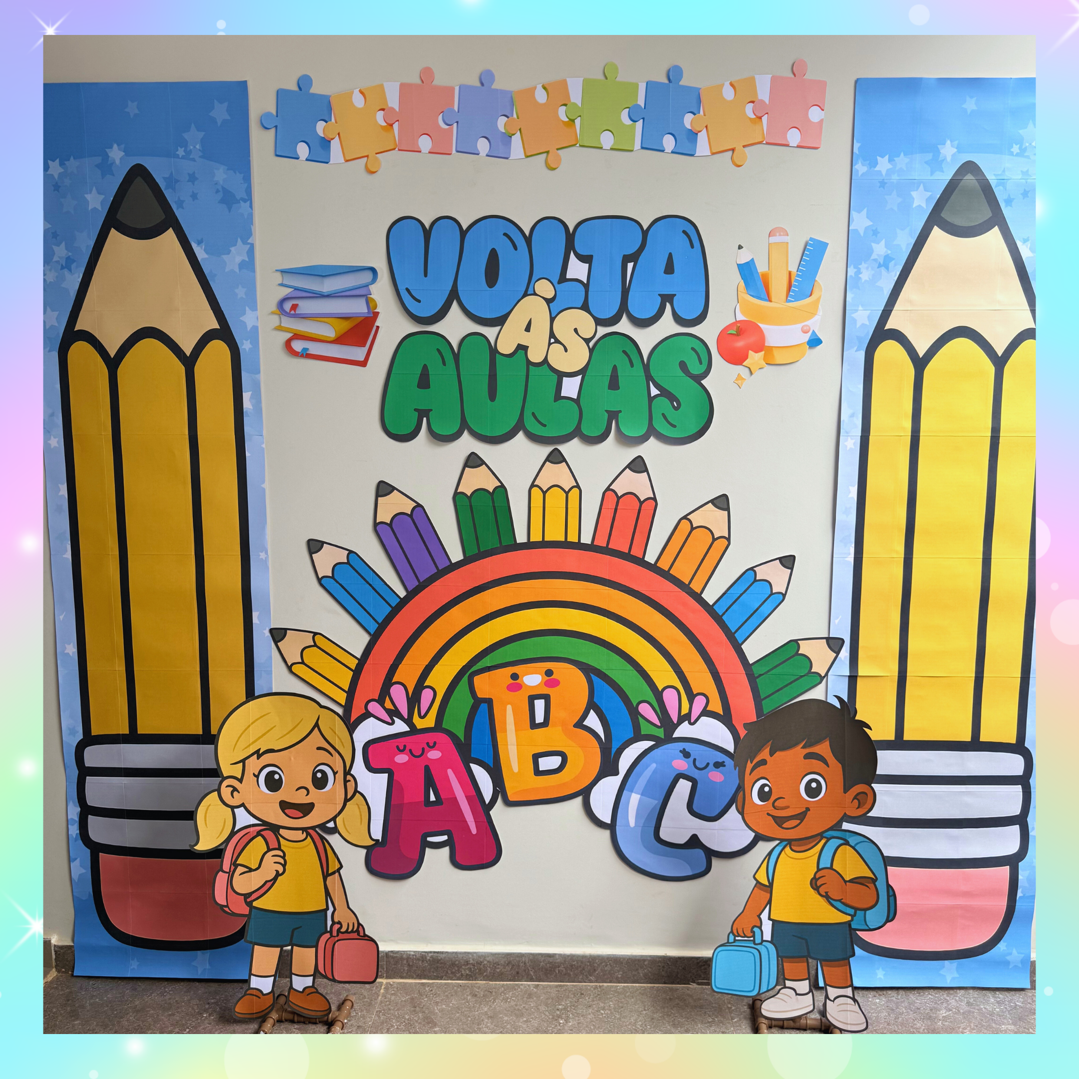 Cada detalhe — dos lápis gigantes ao arco-íris fofinho — foi pensado para tornar