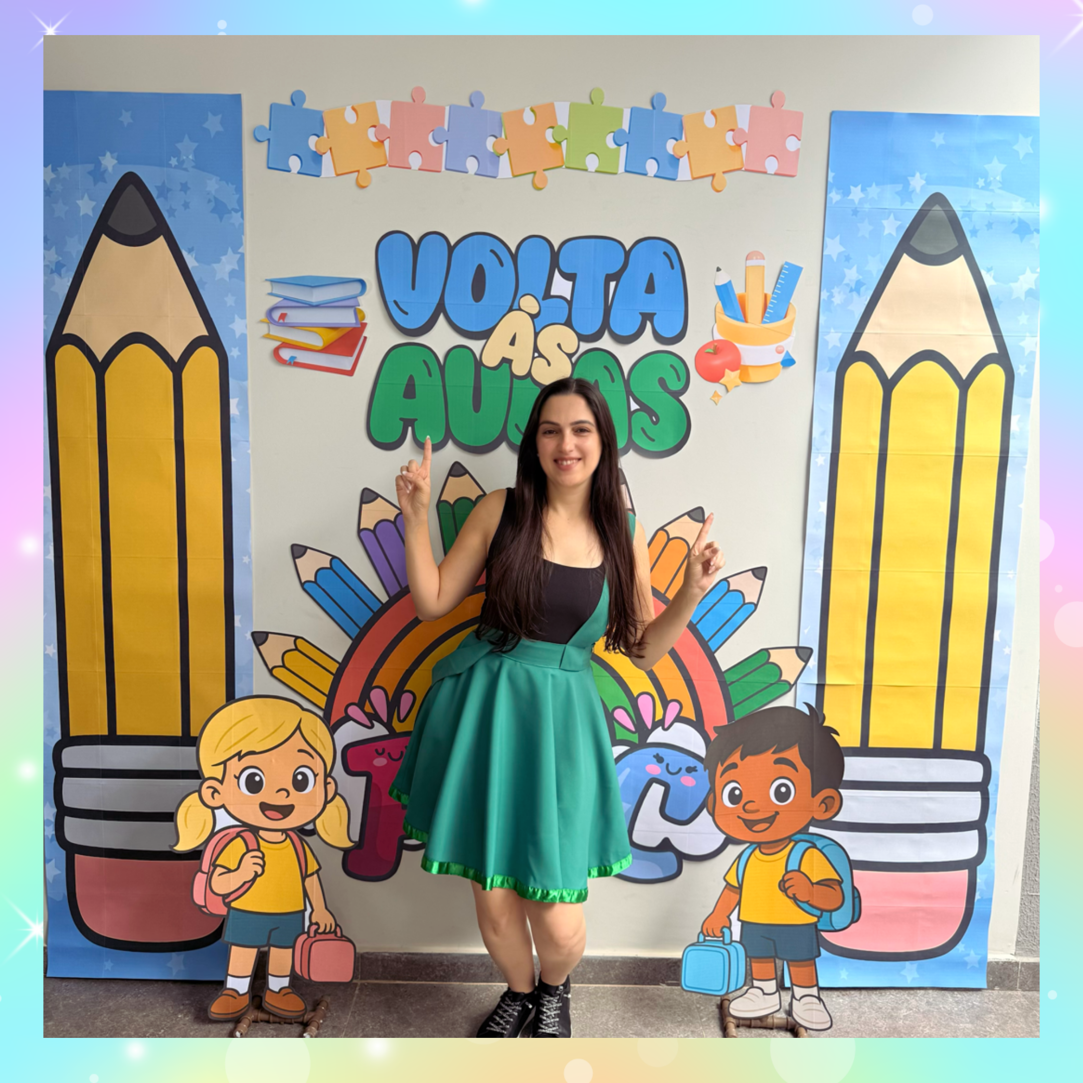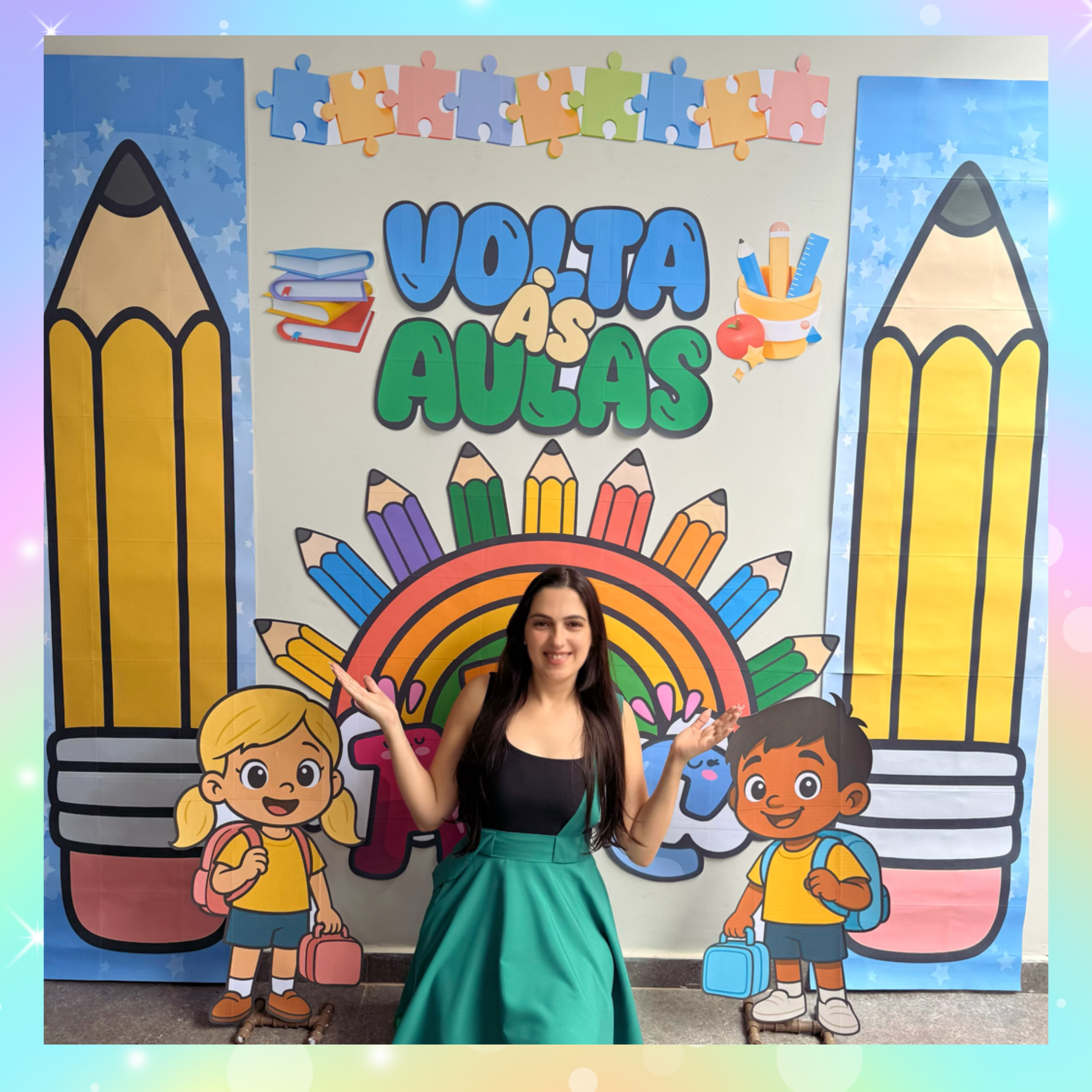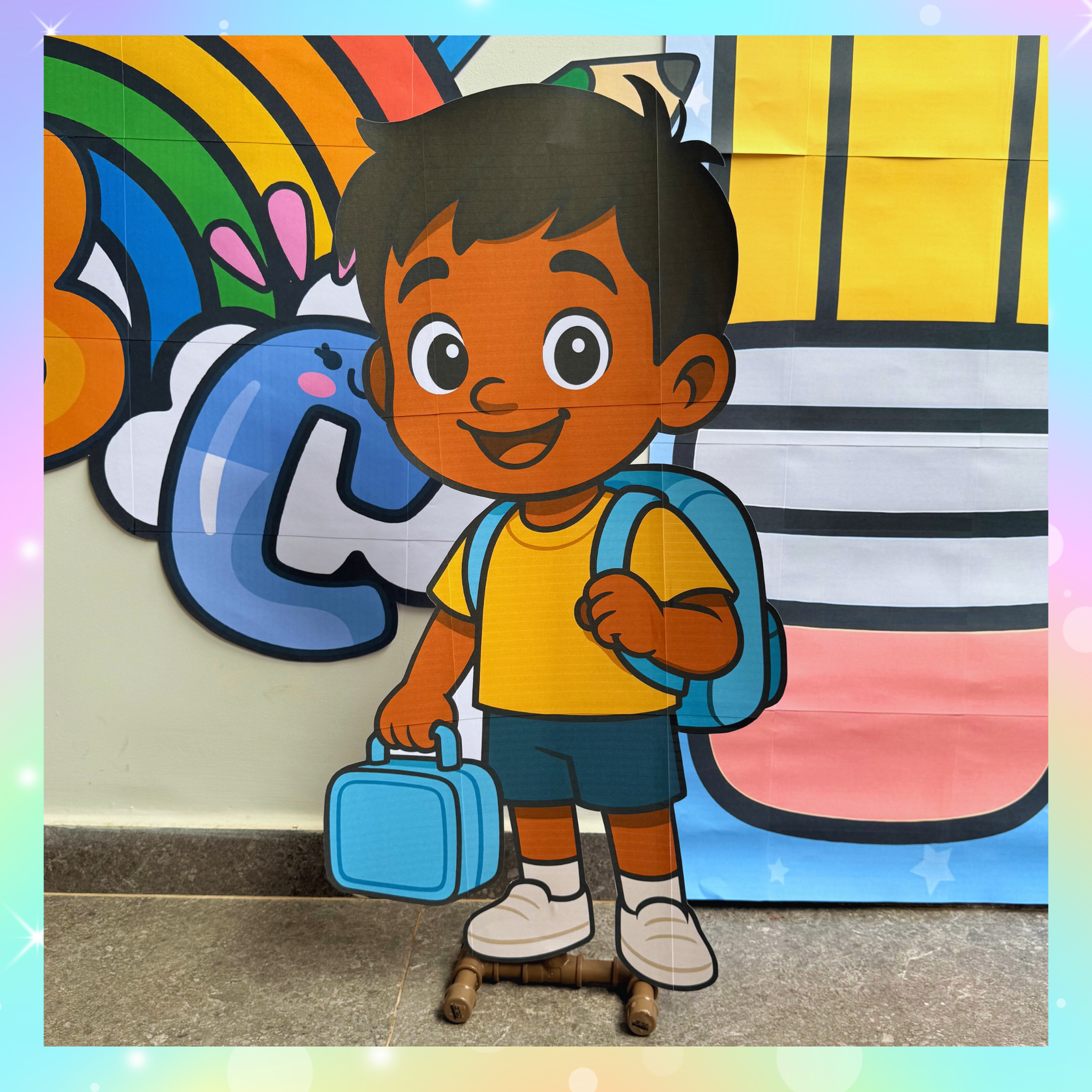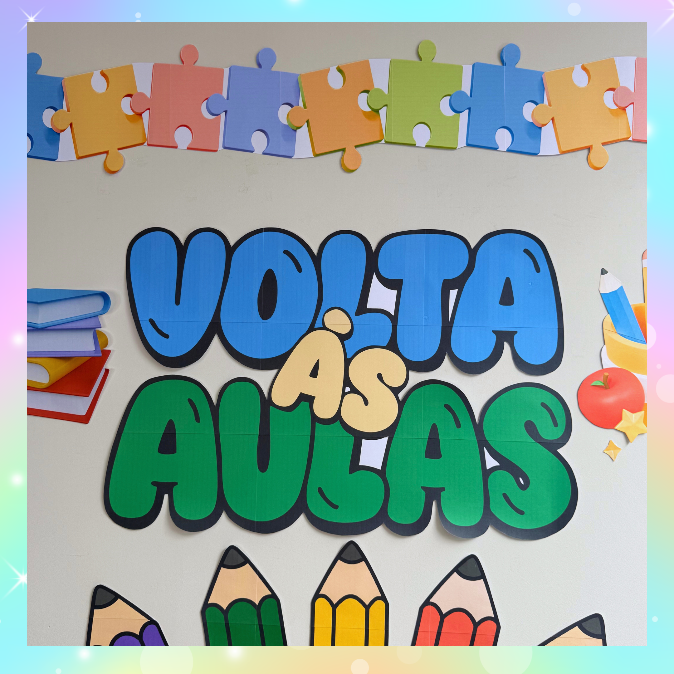 Cada detalhe — dos lápis gigantes ao arco-íris fofinho — foi pensado para tornar